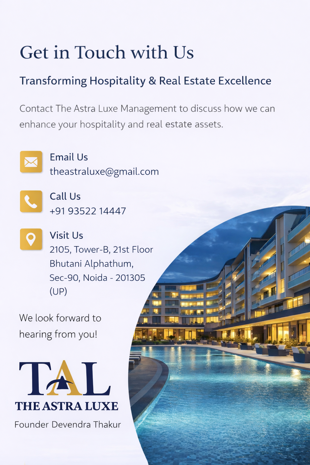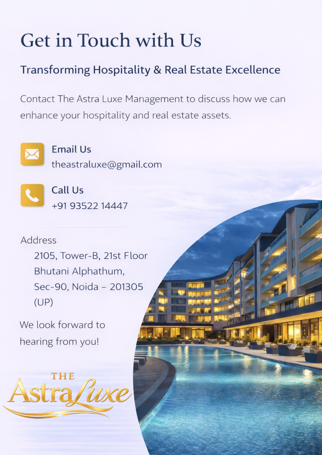 Contact Us We Serve You the Best - Please Leave Your Message Name *Street AddressCity *Phone Number *Email Address *Message0 / 180Submit Contact Details +91-93522 14447 theastraluxe@gmail.com